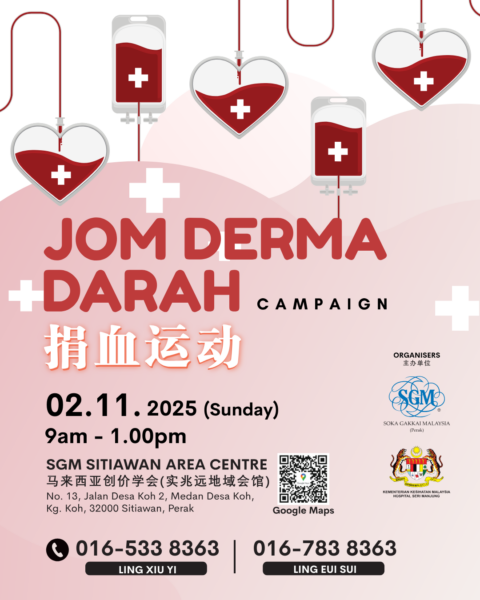 On November 2, Soka Gakkai Malaysia (SGM) Perak branch will co-organise a blood donation campaign with Hospital Seri Manjung at SGM Sitiawan Area Centre in raising blood reserves for the hospital’s blood bank.