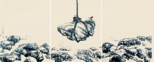 作品中,画家以巨石为主题,传递“初心在,我就在”的坚定信念。画面呈现一块被绳索牢牢悬挂于中央的大石头,绳索究竟象征着约束,抑或是救赎?作品提出发人深省的疑问:是已经放下了,还是放不下?是渴望解脱,还是选择安稳地被悬挂?