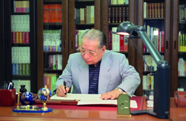 为向挑战自身“人间革命”的全世界会员送上勇气与希望,池田先生伏案执笔。(1999 年 3 月,东京牧口纪念会馆)