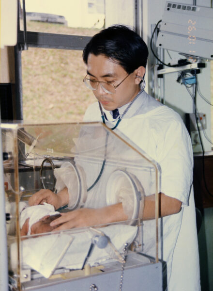 Inspired by President Ikeda’s poem, Dr Christopher Boey pursued his dream and went on to become a paediatrician. The photograph above shows him at work treating an ill infant in October 1992.
