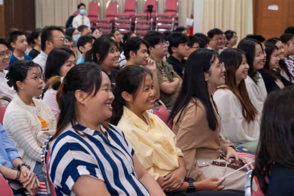 【雪兰莪分会文化会馆】丰中总县男子学生部长谷口英树询问:马来西亚如何在多元化宗教与文化的社会环境中,推广创价理念?雪兰莪男子部员彭椿峰答道:SGM秉持尊重与共生的精神,通过教育与和平交流作为桥梁,以真诚的对话建立互信,从而在社会中扩大共鸣,推动价值创造的理念。