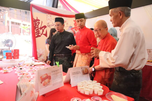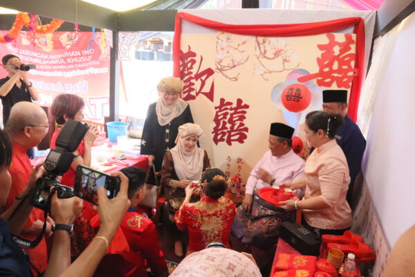 婚礼展区则陈列嫁妆用品、婚礼流程及礼俗介绍,吸引众多观众驻足拍照和交流。活动开幕当天,学会员特别呈现中华传统婚礼仪式:一对身着礼服的新人在众人瞩目之下,依循礼节向森美兰州务大臣拿督斯里阿米努丁及其夫人敬茶,象征文化交流与多元融合的美好意涵。