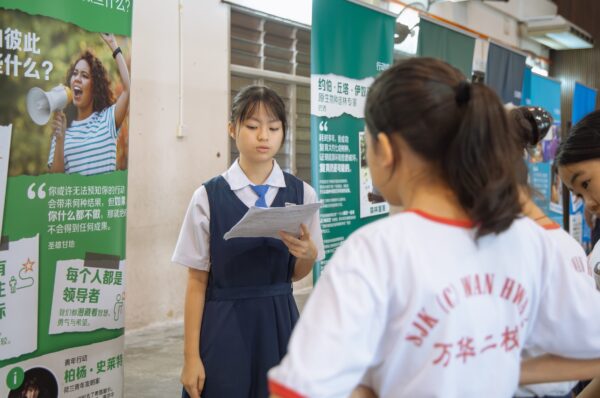 2025年12月2日及3日,霹雳万里望万华二校在校内礼堂举办“希望的种子与行动展”,由13位学生导览员组成讲解队伍,吸引433位师生参观。