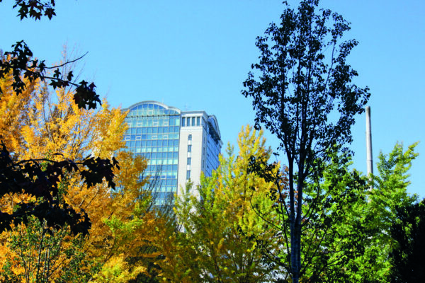 池田先生于 2014 年 11 月 15 日,访问了东京八王子市的创价大学。池田先生视察了深秋的校园。万里晴空,从“创大丝路右智慧之路”眺望,金黄的银杏美不胜收。本部大楼也显得格外庄严。
