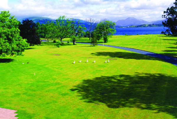 一群鸟儿在广阔的绿毯上嬉戏。——1994 年 6 月,池田大作先生在苏格兰罗蒙湖畔拍摄了这张照片。